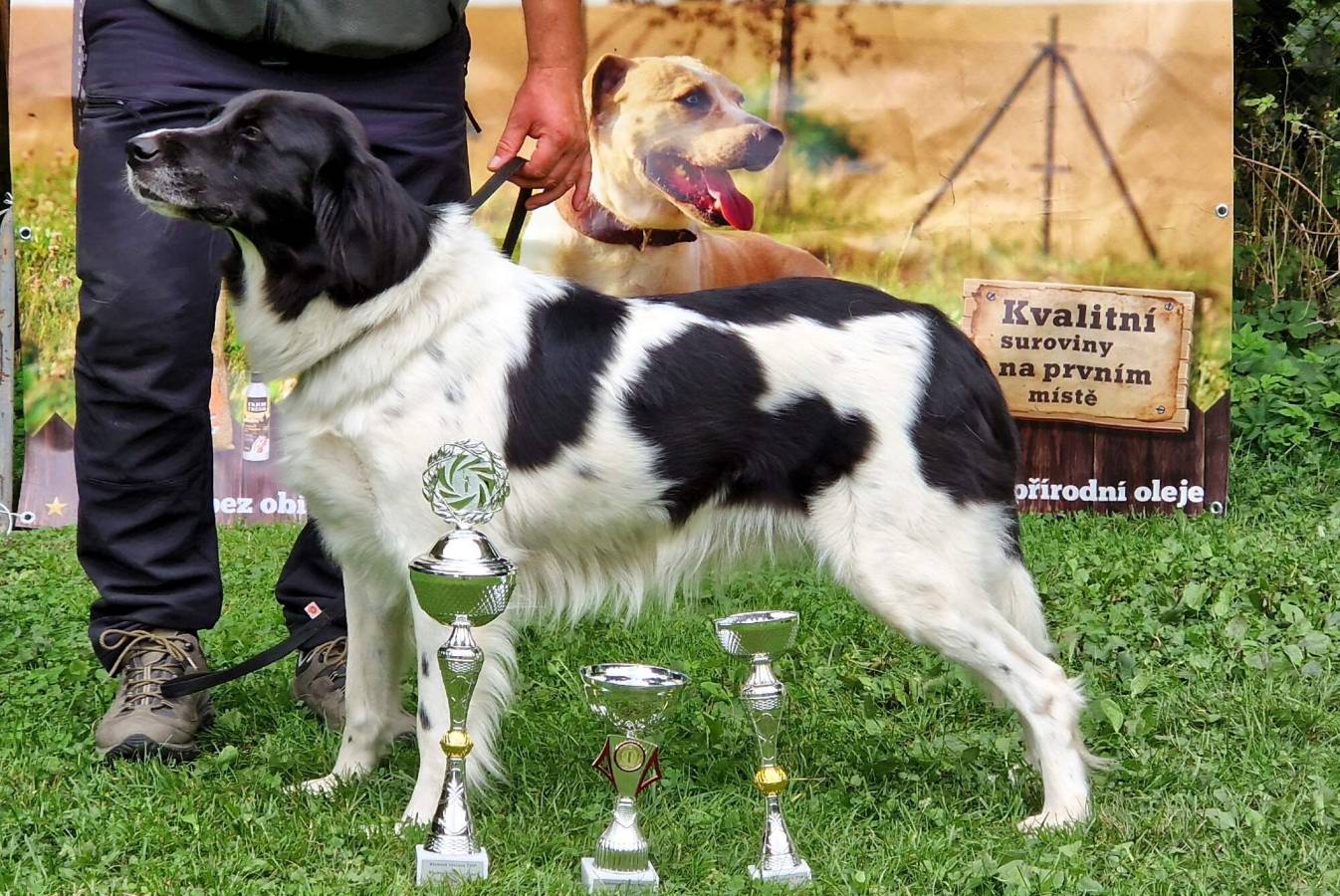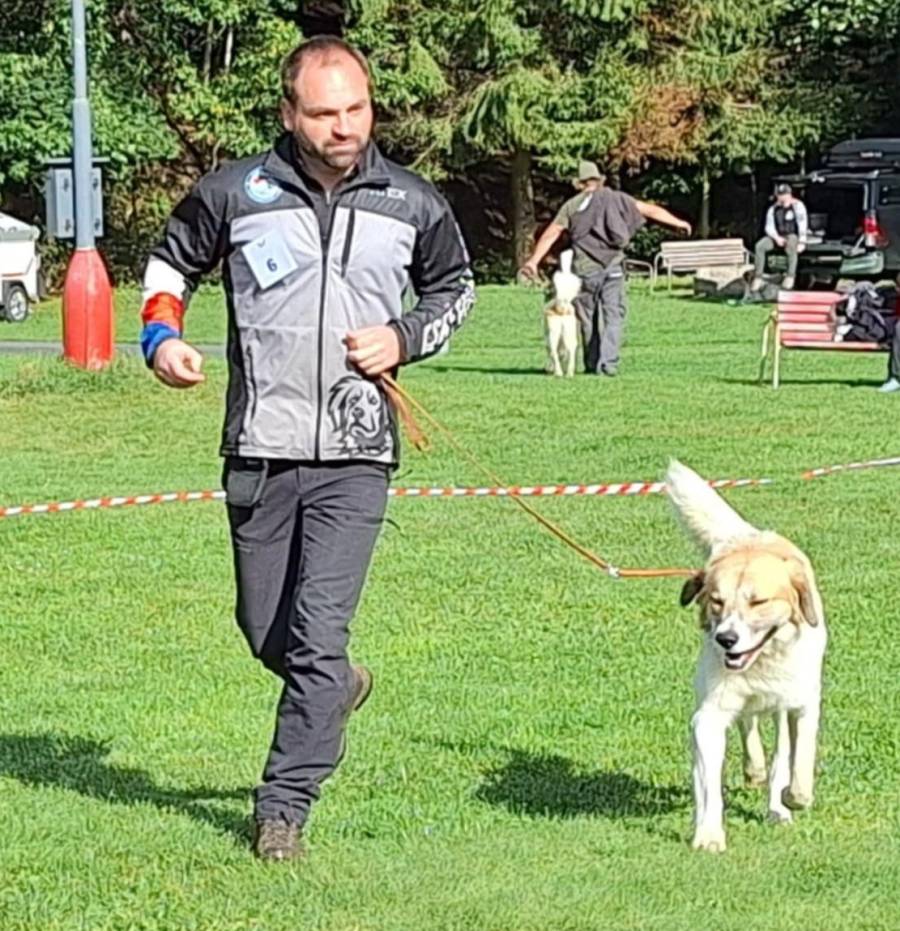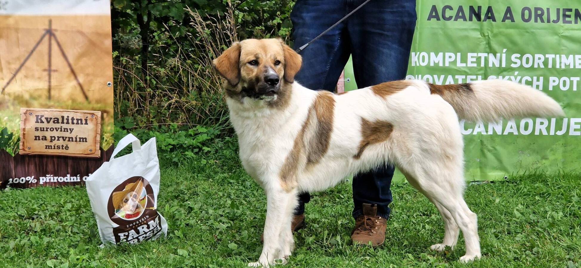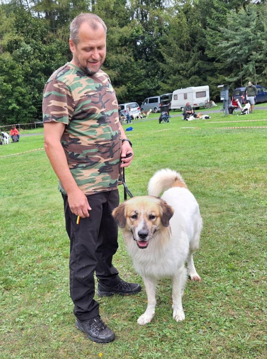 Roční pes silné kostry, správného formátu, výrazná samčí hlava, světlé oko, výborný pigment, výborný front, skus nůžkový, výborné úhlení pánevních končetin, spráný pravidelný pohyb, přátelská povaha. Chybí nahoře 2xP1