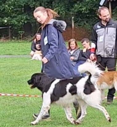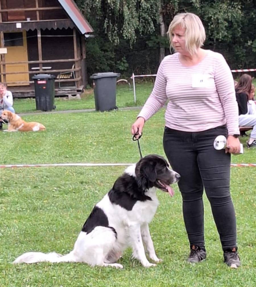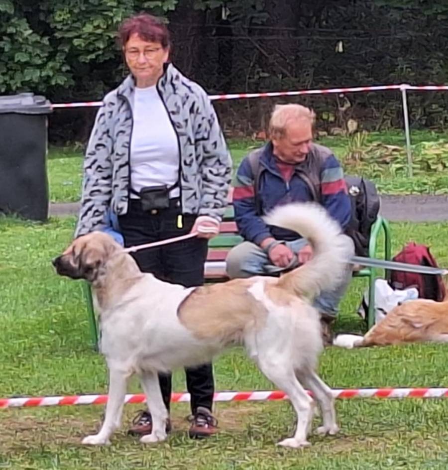 5 letá mohutná fena, výborného tělesného rámce i proporcí, ušlechtilá samičí hlava, středně hnědé oko, sytý pigment, výborný front, korektní hřbetní linie, korektní úhlední vzadu, v postoji lehce sbíhá v hleznech a vytáčí tlapky. Pohyb pravidelný, velmi prostorný a plynulý.