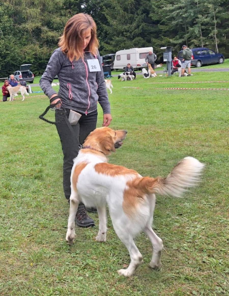 5,5letá fena, výborný tělesný rámec, korektní hlava, středně hnědé oko, výborný pigment, korektní hřbetní linie, chybí předhrudí, lehce strmější úhlení vpředu i vzadu. Často přechází v pohybu do mimochodu.